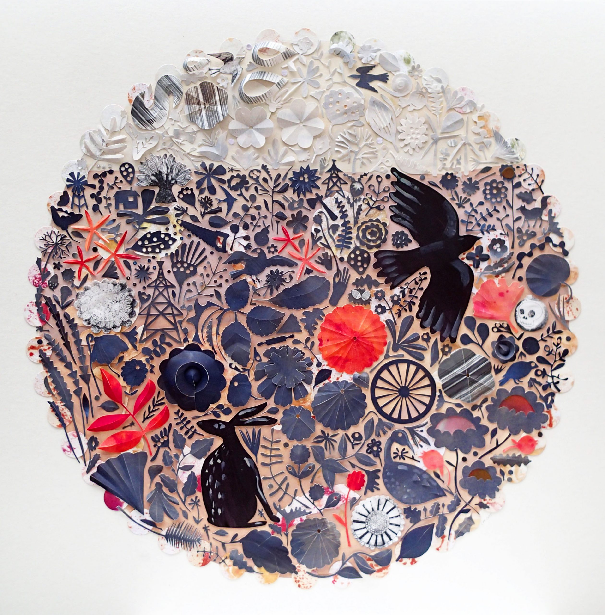I make intricate cut paper collages inspired by textile patterns and folk art, using imagery from historical printed fabrics and experiences of domestic life.